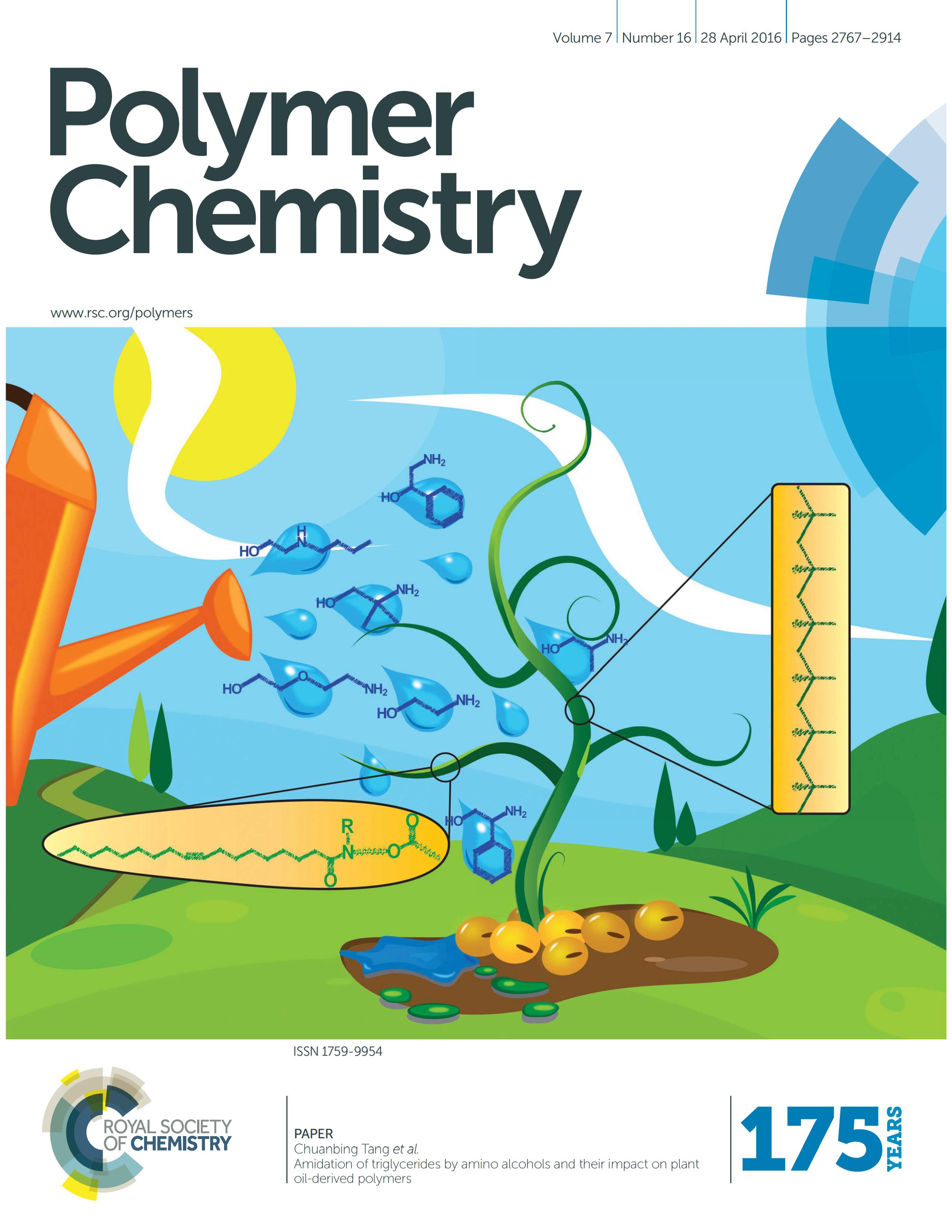 Yuan L.; Wang Z.; Trenor N.; Tang C.* Amidation of Triglycerides by Amino Alcohols and Their Impact on Plant Oil-Derived Polymers . Polym. Chem., 2016, 7, 2790–2798. Selected as the front cover.